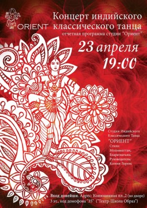 18 Апр 2016 Концерт индийского классического танца студии "Ориент" автор Admin | | 0 Calendar Когда: @ 2016-04-23T19:00:00+03:00 2016-04-23T19:30:00+03:00 Где: Санкт-Петербург, Театр-школа "Образ" Конюшенная пл. 2, Санкт-Петербург, Россия 191186 Стоимость: Бесплатно Контакт: Студия "Ориент" +7 953 370 21 57 e-mail Событие сайта Индийский танец НАРОДНАЯ Санкт-Петербург СМОТРЕТЬ В программе будут представлены танцевальные композиции в стилях Бхаратанатьям и Мохиниаттам.