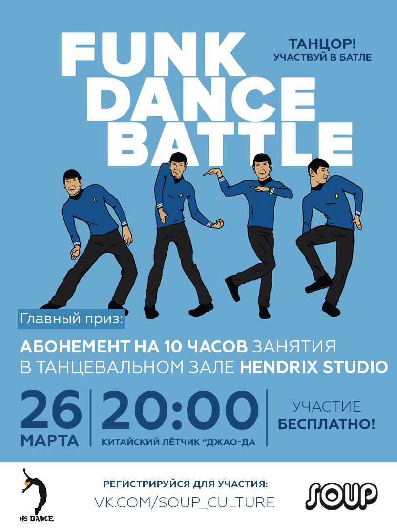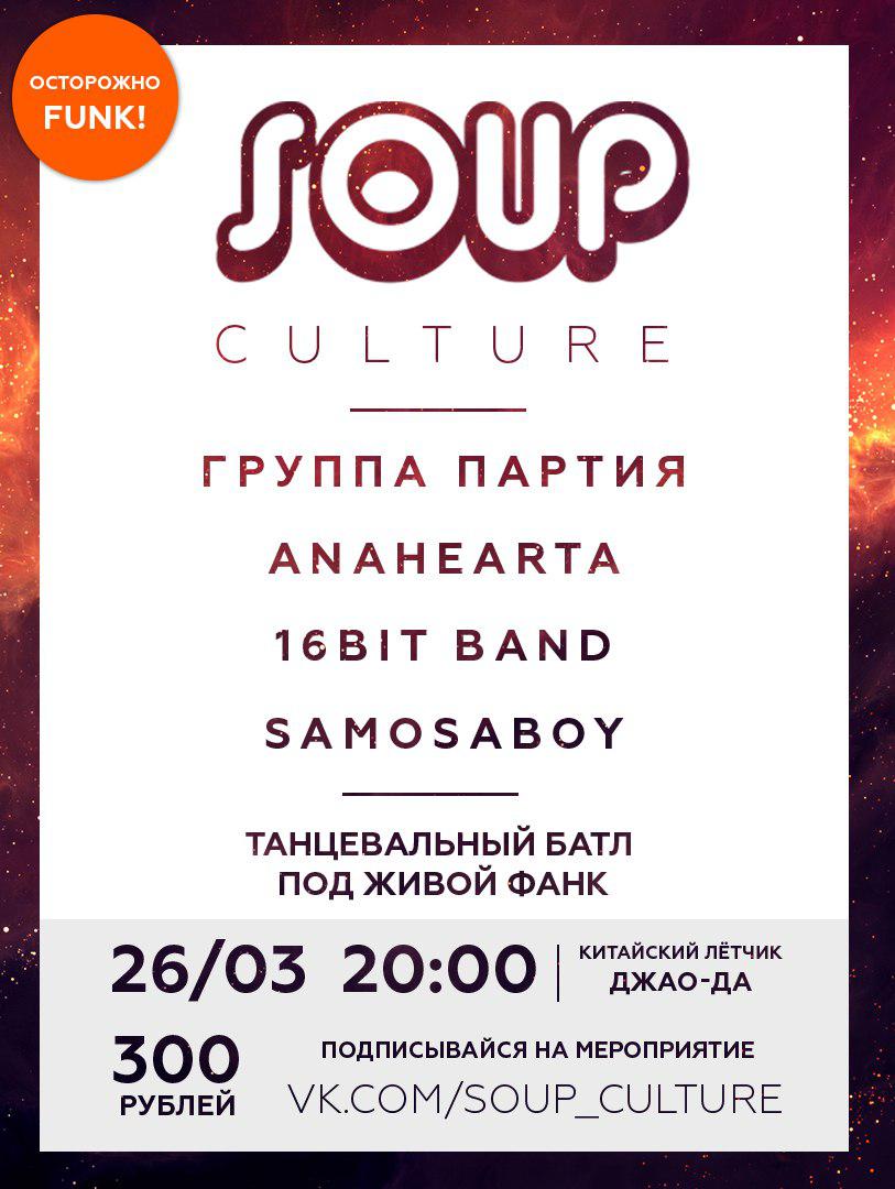 26 марта в "Китайском летчике Джао Да" четыре московских бенда будут жарить сочный фанк на вечеринке SOUP. Там же пройдет locking battle для танцоров любого уровня - все участники получат в подарок по часу аренды в новом танцевальном центре Hendrix на Шаболовской, а победитель - абонемент на 10 часов!
